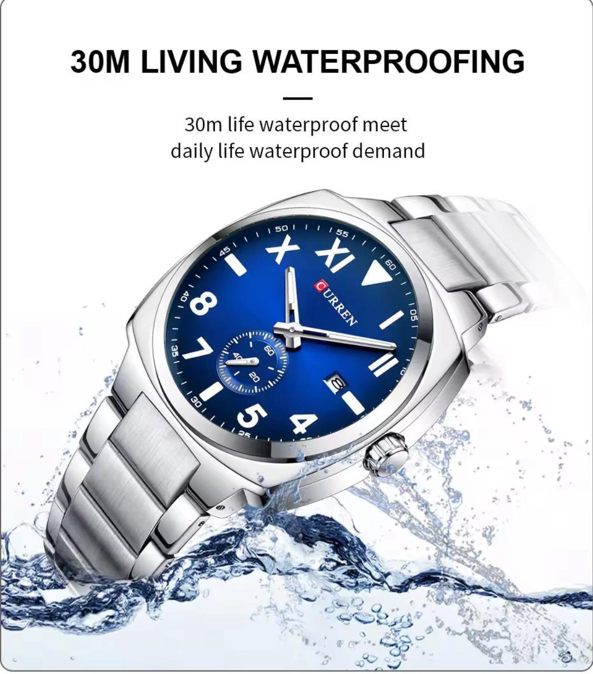 Water resistant Date display Battery powered Stainless steel